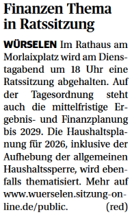 • Ratssitzung der Stadt Würselen Dezember 14, 2025